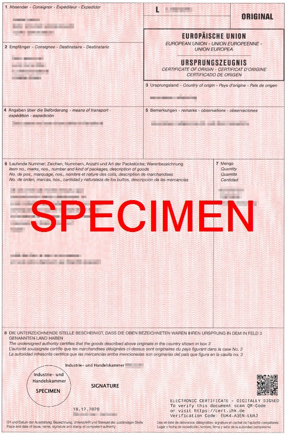 The 79 German Chambers of Commerce and Industry, CCI (IHK) representing 3.6 million companies from industry, commerce and services, issue CoO.
